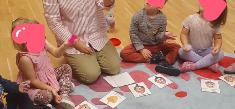 Ciąg dalszy jesiennych ćwiczeń logopedycznych. Z kasztanem i żołędziem usprawnialiśmy nasze wargi, język i ćwiczyliśmy oddech. Poznaliśmy jak wymawiamy samogłoski i umiemy je rozpoznać po ułożeniu warg. Pani Edyta zawsze przynosi coś ciekawego. Dmuchaliśmy kolorowe piórka.