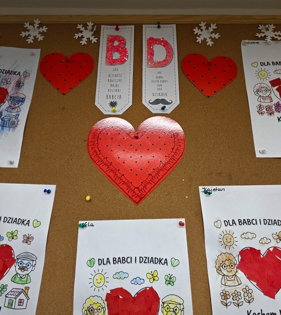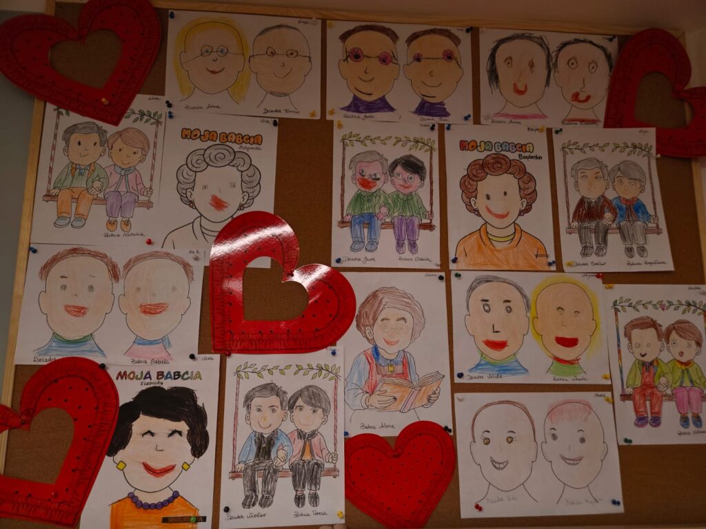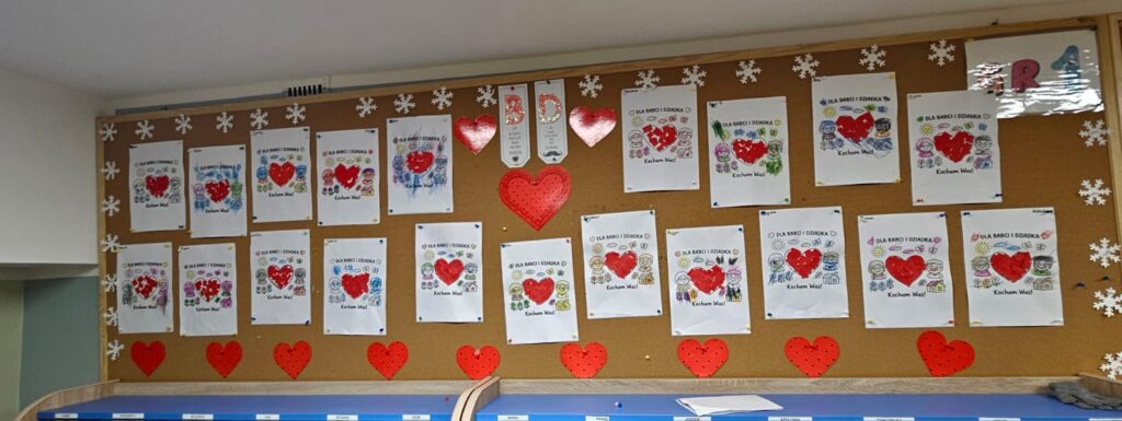 Nasze przedszkolaki występowały dla swoich Babć i Dziadków śpiewem, tańcem i recytacją wierszy. Było mnóstwo wzruszeń. A po zakończonych występach wnuki wręczyły prezenty, które z Paniami Wychowawczyniami wykonały na tę okazję. Sali i szatnia były udekorowane pracami z okazji Ich święta.