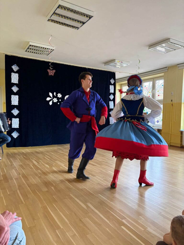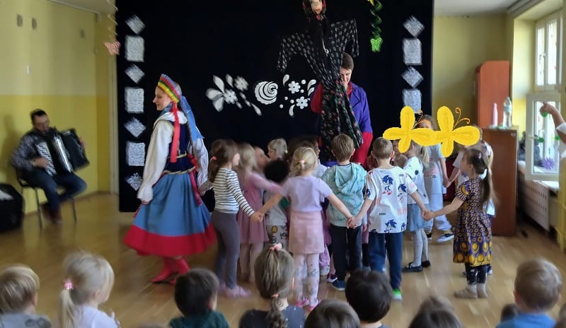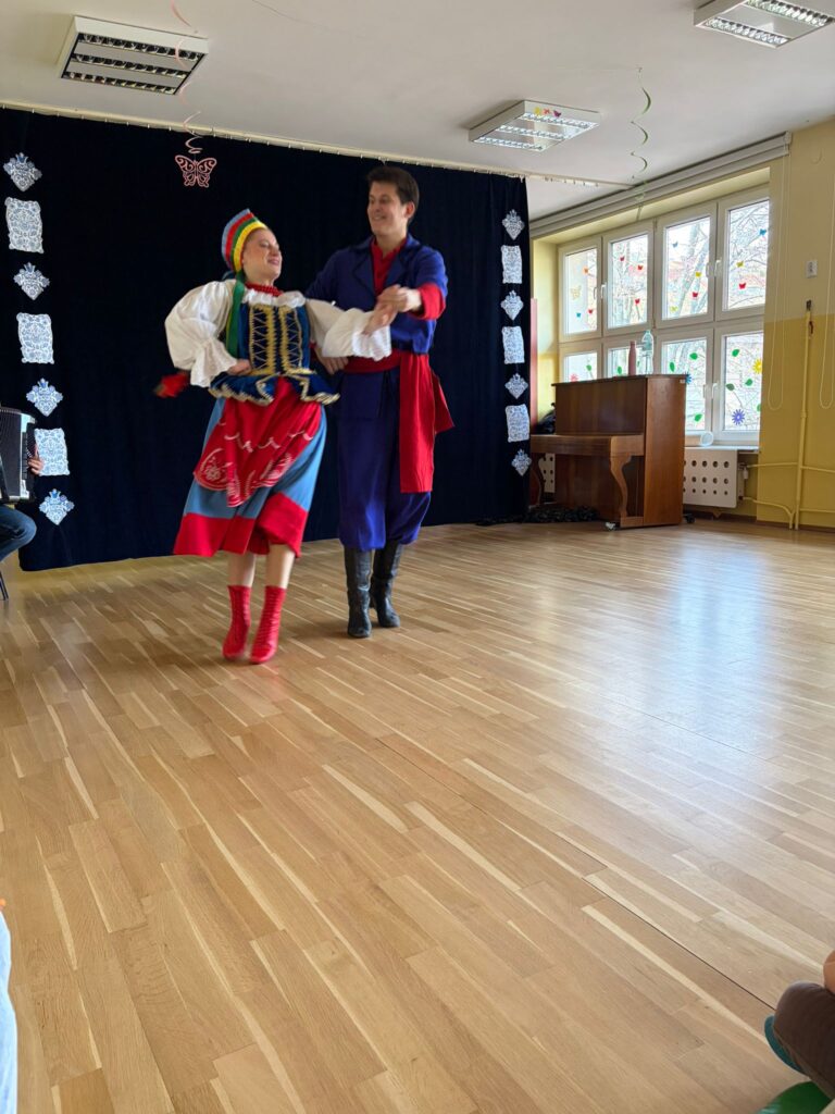 Dzięki naszym gościom mogliśmy nauczyć się kroku podstawowego kujawiaka i zobaczyć przykładową Marzannę .