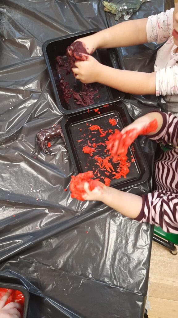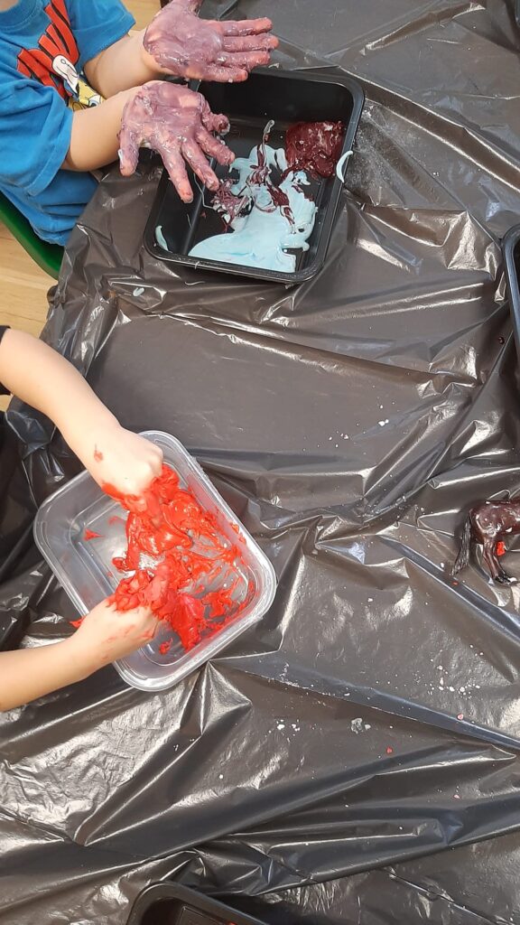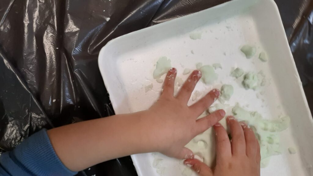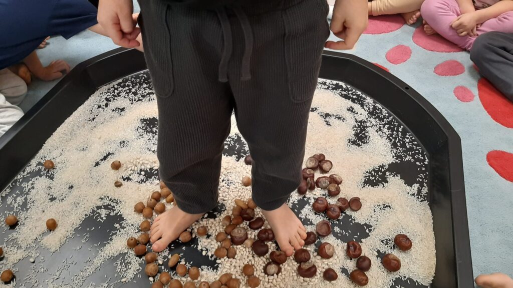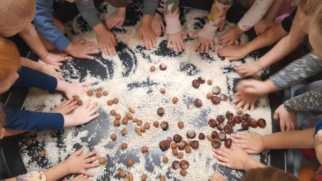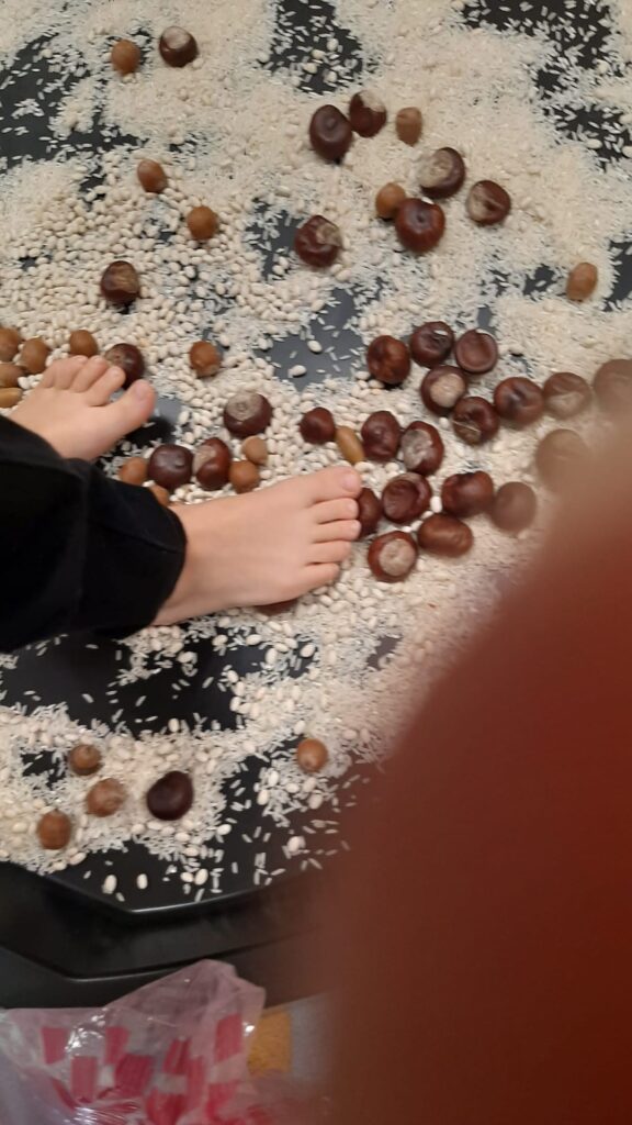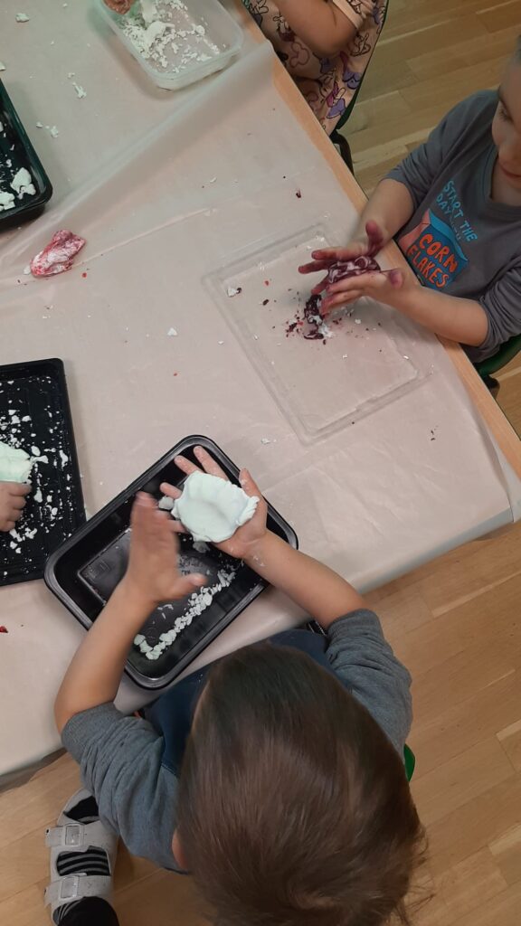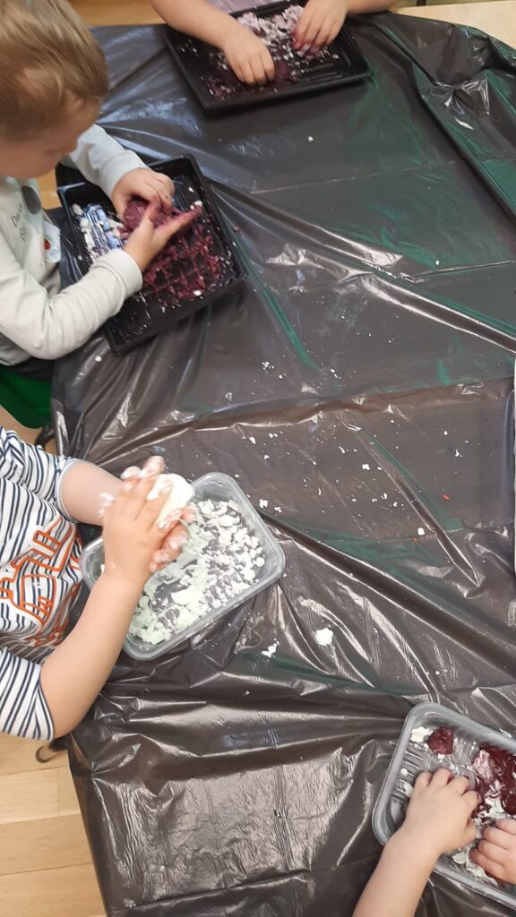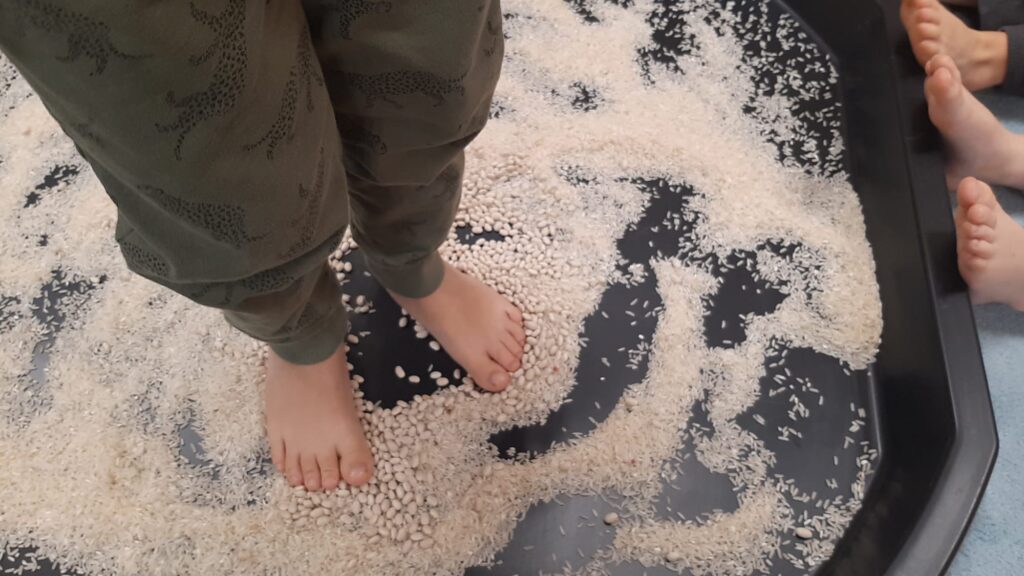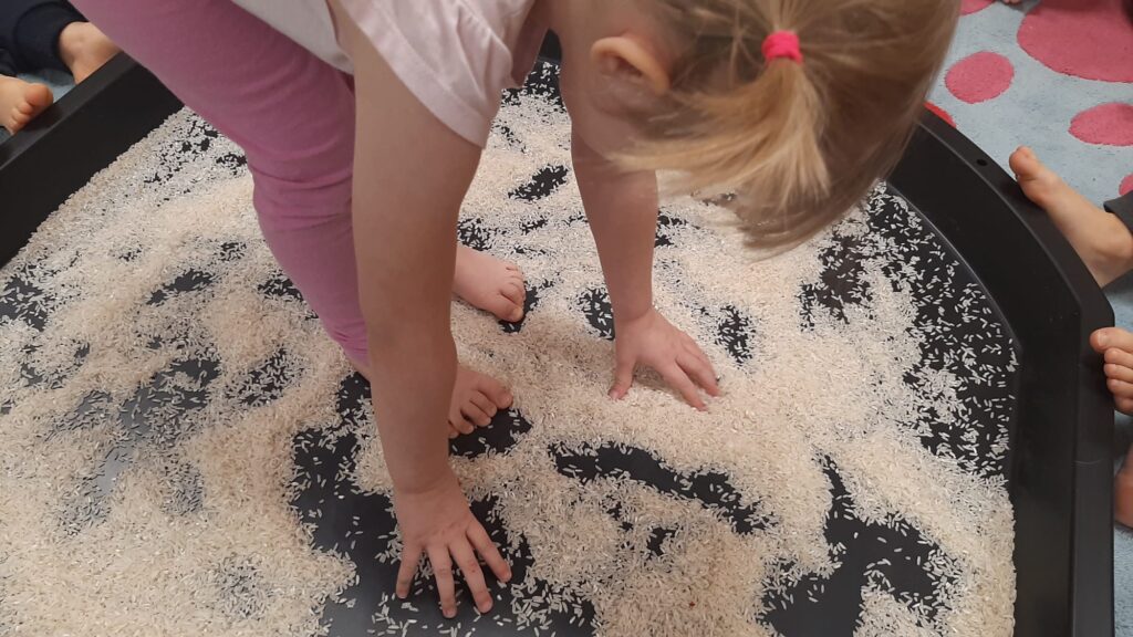 Podczas czwartkowych zajęć dzieci miały okazję doświadczyć różnych faktur i oporów- od miękkiej mydloliny( mąka ziemniaczana, mydło w płynie i barwnik spożywczy) przez sypki ryż, fasolę, materiał przyrodniczy.
