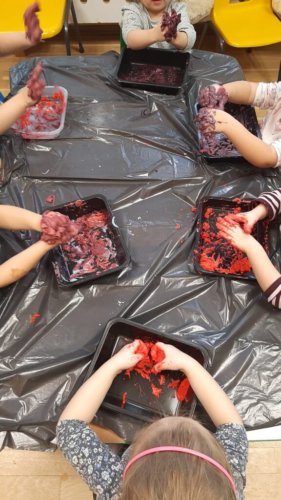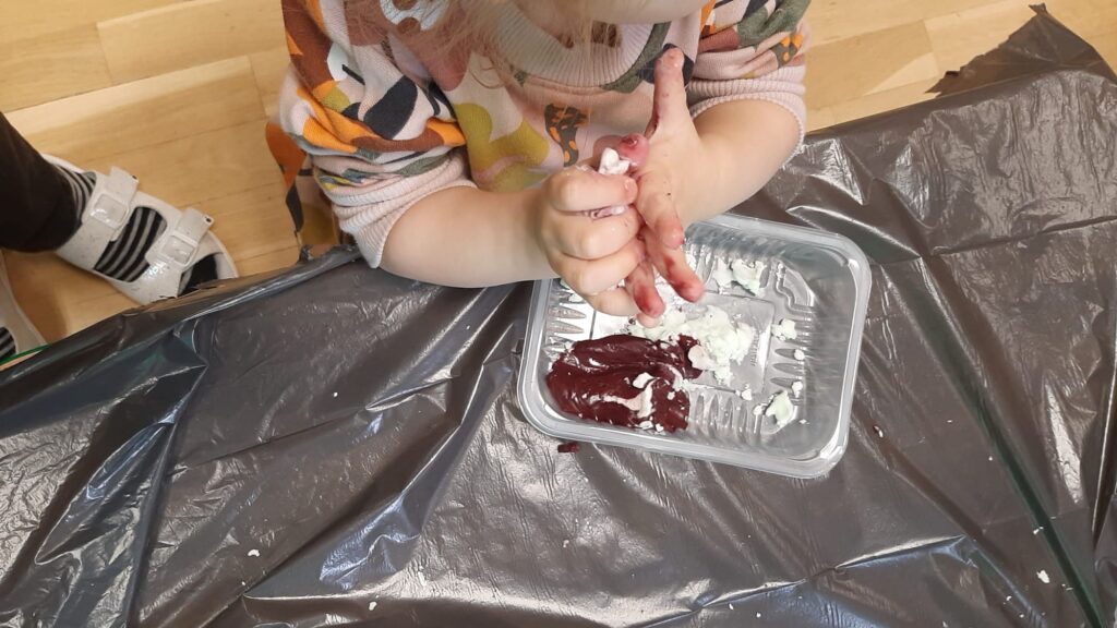 Dzięki tym zabawom maluchy uczą się lepiej odbierać bodźce z otoczenia, regulować napięcie mięśniowe. Rozwijają także ciekawość, oraz świadomość rąk ( chociaż nóżki też ćwiczyły).To także chwilę wyciszenia i skupienia w przyjaznej i bezpiecznej atmosferze. Dzięki tym aktywnościom dzieci ćwiczą siłę dłoni, sprawność palców, kontrolę ruchu, a w przyszłości ułatwi im m.in.rysowanie wycinanie i inne zadania wymagające precyzji.