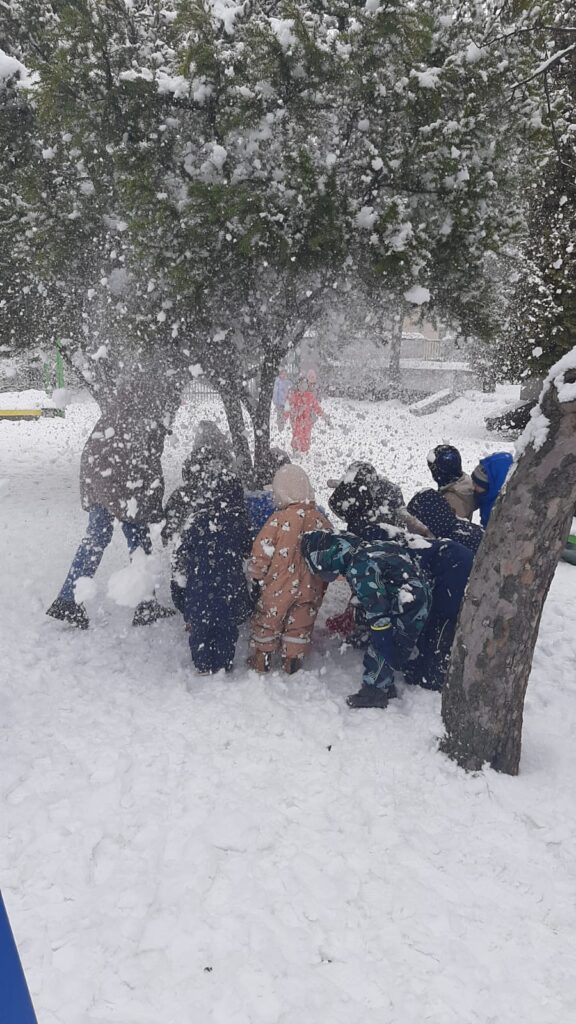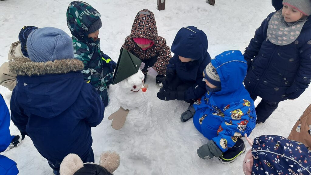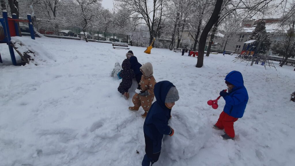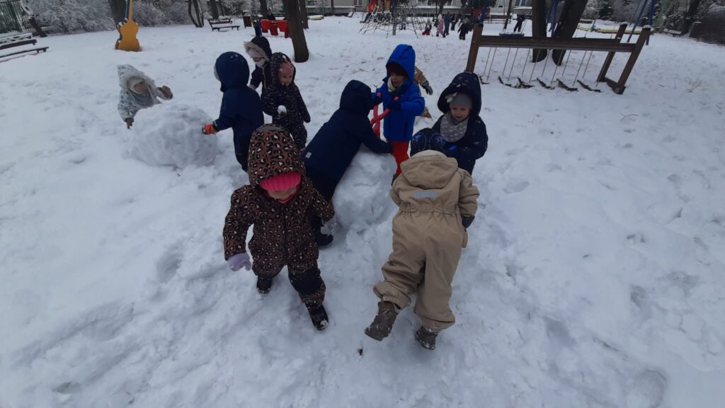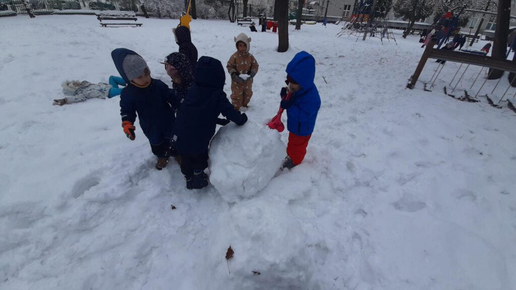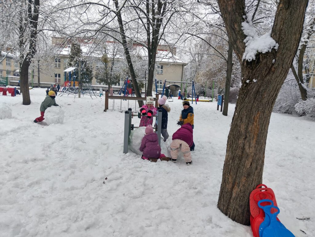 Korzystając z zimowej aury, wybraliśmy się do ogrodu przedszkolnego na zabawy śniegowe. Dzieci z radością lepiły bałwana, brały udział w wesołej bitwie na śnieżki, strząsały śnieg z drzew i krzewów, obserwując jak opada na ziemię.