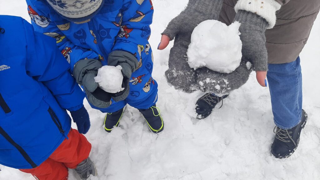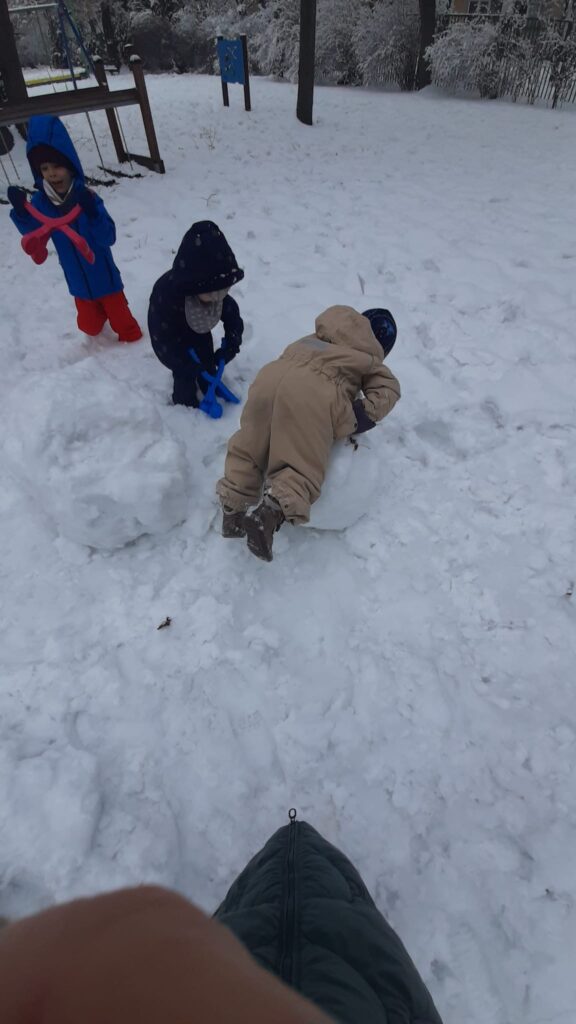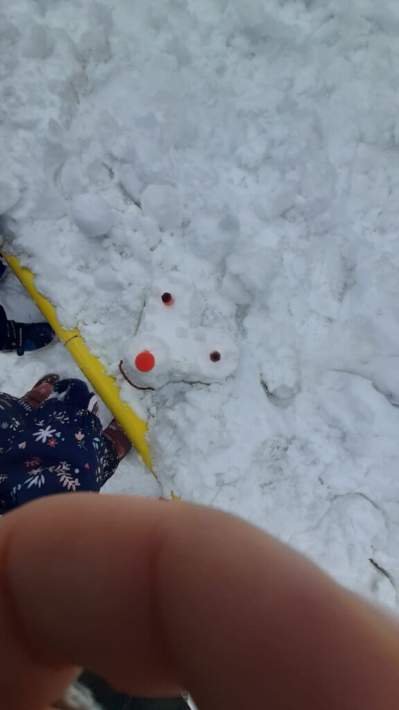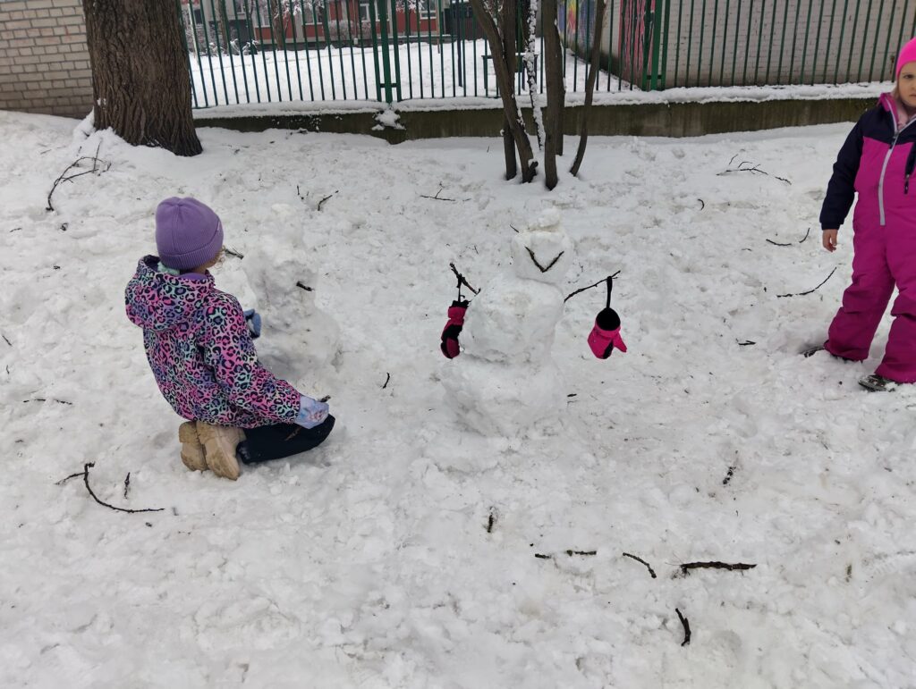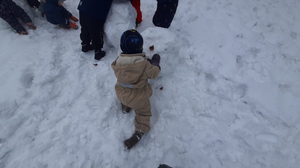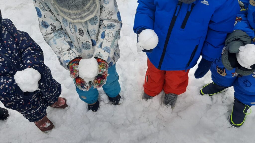 Korzystając z zimowej aury, wybraliśmy się do ogrodu przedszkolnego na zabawy śniegowe. Dzieci z radością lepiły bałwana, brały udział w wesołej bitwie na śnieżki, strząsały śnieg z drzew i krzewów, obserwując jak opada na ziemię.